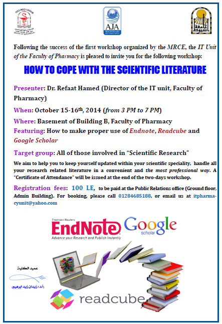 ورشة عمل بكلية الصيدلة عن الاستخدام الأمثل لـ Endnote, Readcube and Google Scholar يومي 15 ، 16/10/2014م. 8 أكتوبر 2014 ورشة عمل بكلية الصيدلة عن الاستخدام الأمثل لـ Endnote, Readcube and Google Scholar يومي 15 ، 16/10/2014م.