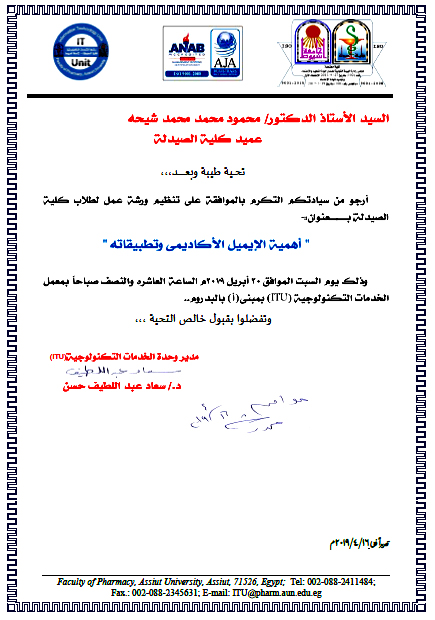 ورشة عمل بعنوان "أهمية الإيميل الأكاديمي وتطبيقاته" تنظمها وحدة الخدمات التكنولوجية لطلاب كلية الصيدلة يوم السبت الموافق 20-4-2019م. 17 أبريل 2019 ورشة عمل بعنوان "أهمية الإيميل الأكاديمي وتطبيقاته" تنظمها وحدة الخدمات التكنولوجية لطلاب كلية الصيدلة يوم السبت الموافق 20-4-2019م.