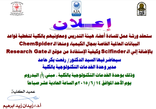 ورشة عمل للسادة أعضاء هيئة التدريس ومعاونيهم بكلية الصيدلة عن ChemSpider ، Scifinder ، Research Gate يوم الأحد الموافق 14/6/2015م. 10 يونيو 2015 ورشة عمل للسادة أعضاء هيئة التدريس ومعاونيهم بكلية الصيدلة عن ChemSpider ، Scifinder ، Research Gate يوم الأحد الموافق 14/6/2015م.