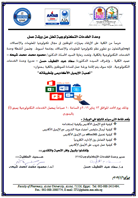 ورشة عمل للسادة الموظفين بكلية الصيدلة عن "أهمية الإيميل الأكاديمي وتطبيقاته" يوم الأحد الموافق 13 يناير 2019م بوحدة الخدمات التكنولوجية بالكلية. 8 يناير 2019 ورشة عمل للسادة الموظفين بكلية الصيدلة عن "أهمية الإيميل الأكاديمي وتطبيقاته" يوم الأحد الموافق 13 يناير 2019م بوحدة الخدمات التكنولوجية بالكلية.