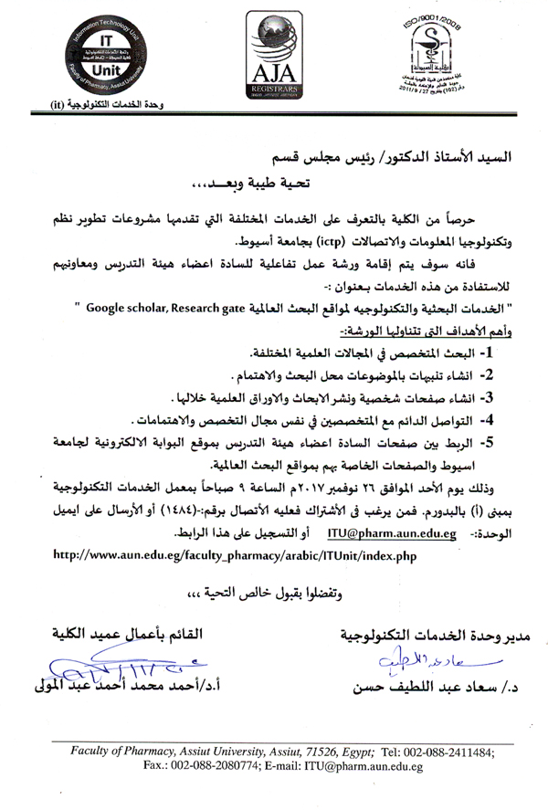 ورشة عمل تفاعلية للسادة أعضاء هيئة التدريس ومعاونيهم بكلية الصيدلة تحت عنوان الخدمات البحثية والتكنولوجية لمواقع البحث العالمية Google scholar, Research gate يوم الأحد الموافق 26-11-2017م.