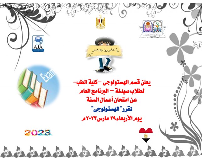 يعلن قسم الهستولوجى –كلية الطب- لطلاب صيدلة – البرنامج العام عن امتحان أعمال السنة لمقرر" الهستولوجى" يوم الأربعاء 29 مارس 2023م 22 مارس 2023