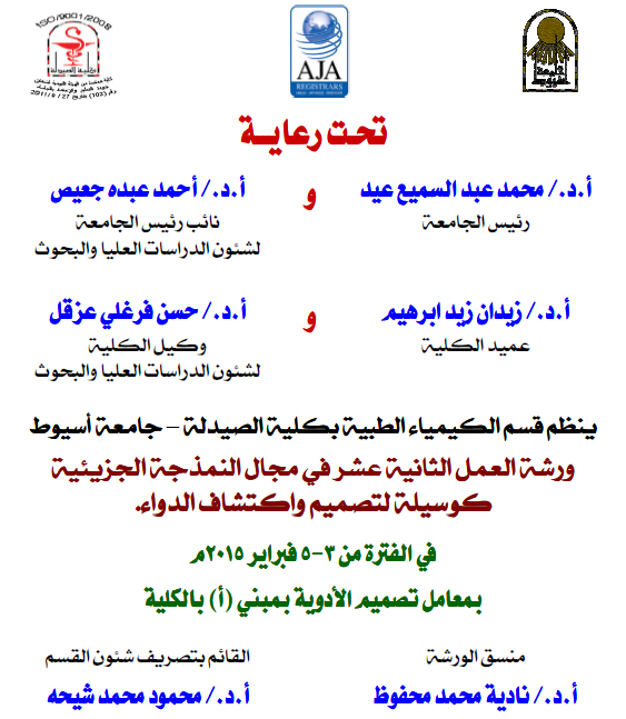 ينظم قسم الكيمياء الطبية بكلية الصيدلة – جامعة أسيوط ورشة العمل الثانية عشر في مجال النمذجة الجزيئية كوسيلة لتصميم واكتشاف الدواء. في الفترة من 3-5 فبراير 2015م.