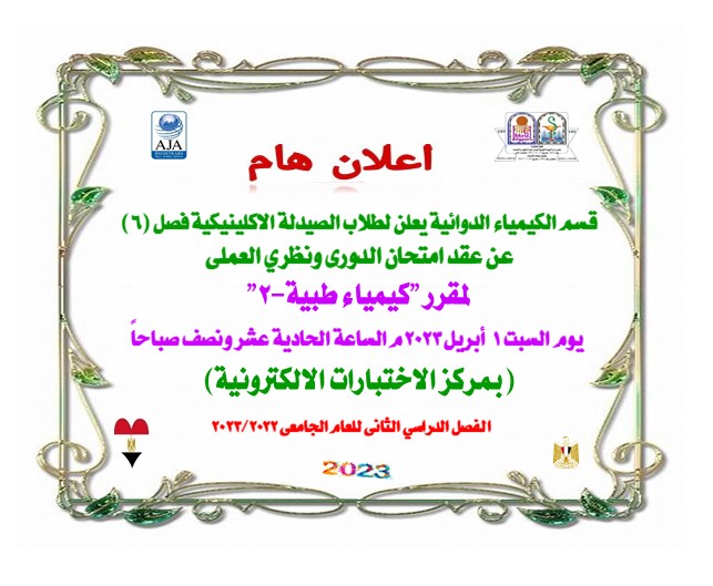 The Department of Pharmaceutical Chemistry announces to clinical pharmacy Program students, semester (6), the holding of the periodic and theoretical practical exam for the course "Medicinal Chemistry-2" on Saturday, April 1, 2023 at eleven thirty