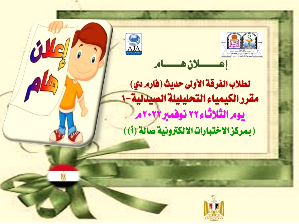 Important Announcement for First-year Students (Pharm D) the midterm exam for Pharmaceutical Analytical Chemistry-1 on Tuesday, November 22, 2022 (in the Electronic Exam Center, Hall (A))