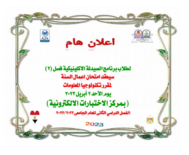 Important Announcement for Students of the Clinical Pharmacy Program, Semester 2 mid-term exam for the course "Technology Information" on Sunday, April 2, 2023