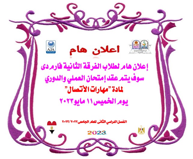 An important announcement for the students of the second year Pharm D. The practical and periodic exam for the "Communication Skills" Course will be held on Thursday, May 11, 2023