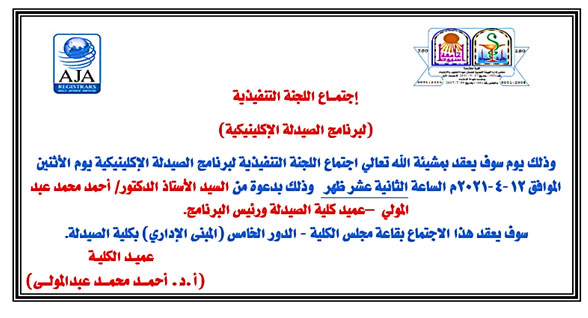 اجتماع اللجنة التنفيذية (لبرنامج الصيدلة الإكلينيكية) بكلية الصيدلة يوم الأثنين الموافق 12-4-2021م. 7 أبريل 2021