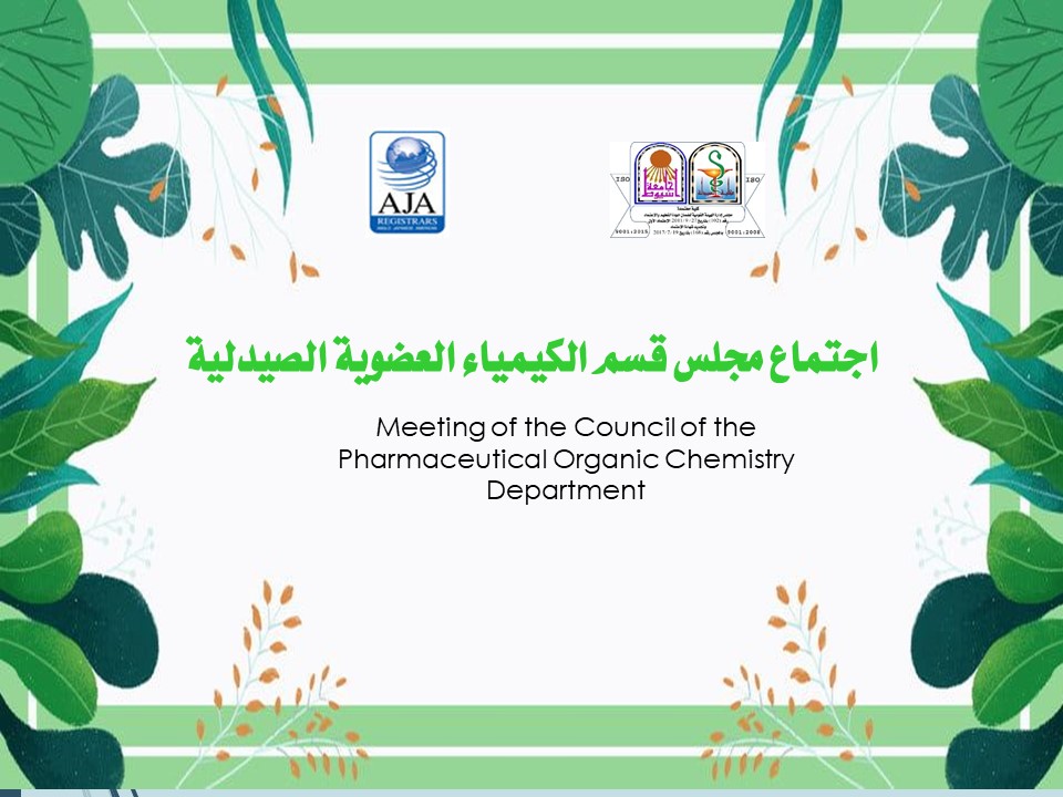 اجتماع مجلس قسم الكيمياء العضوية الصيدلية يوم الأربعاء الموافق 6 أبريل 2022م الساعة الحادية عشر صباحاً