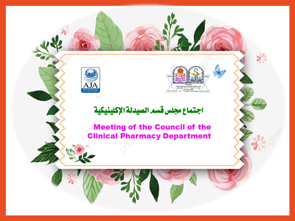 اجتماع مجلس قسم الصيدلة الإكلينيكية بكلية الصيدلة يوم الأربعاء الموافق 8 يونيو 2022م الساعة الواحدة ونصف (ظهراً) 7 يونيو 2022 سوف يعقد بمشيئة الله تعالي اجتماع مجلس قسم الصيدلة الإكلينيكية بكلية الصيدلة رقم (77) يوم الأربعاء الموافق 8 يونيو 2022م الساعة الواحدة ونصف (ظهراً) وذلك بقاعة اجتماعات مجلس قسم الصيدلة الإكلينيكية – الدور الخامس (مبني أ) بقاعة اجتماعات مجلس القسم