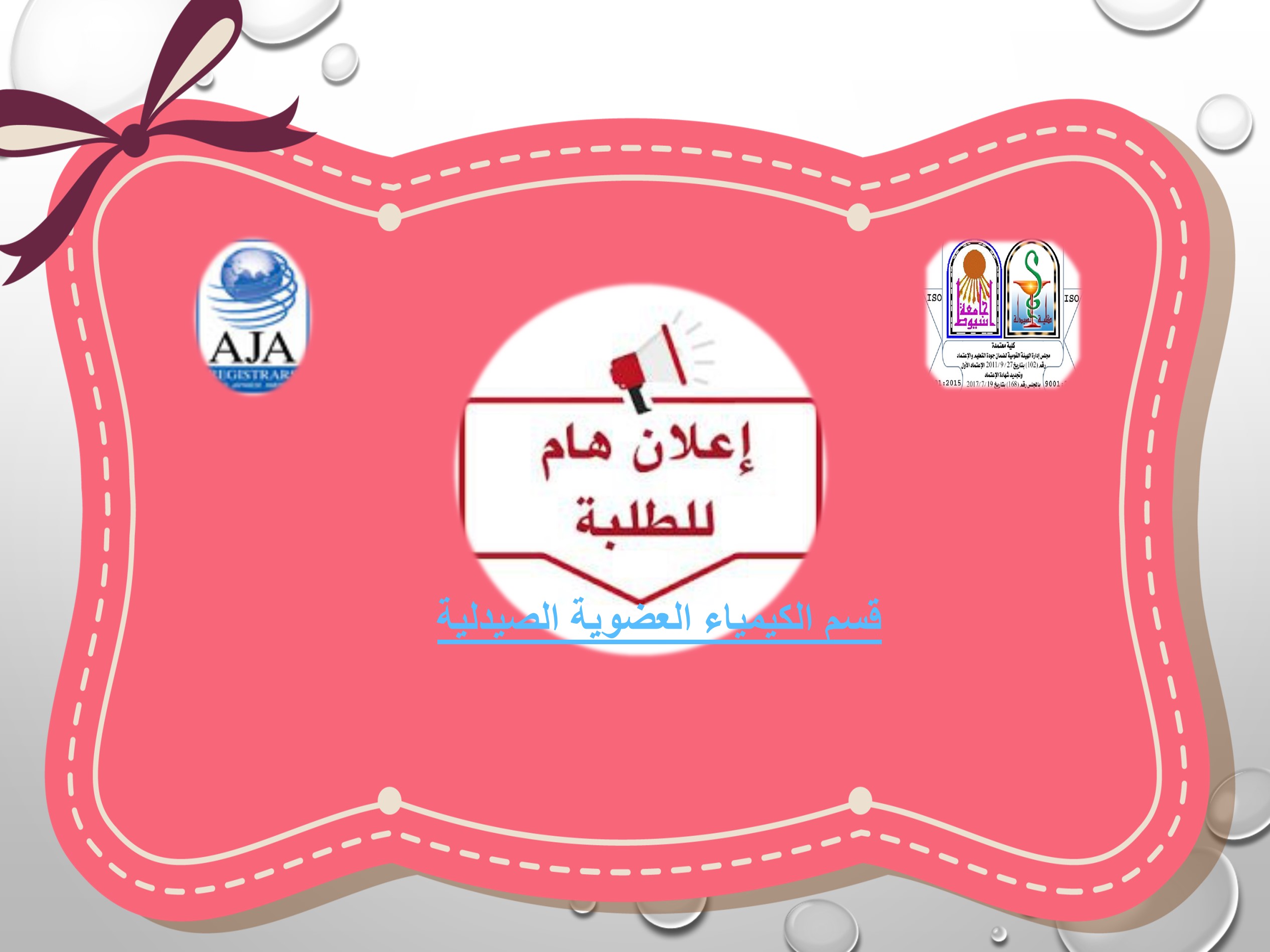إعلان هام المستوى االأول فارم دى فصل 2 (عام وكلنيكال) مقرر كيمياء عضوية صيدلية-2 عقد اختبار اعمال السنة (جزء د/ حجاج حسن وجزء د/ عنبر فنجرى) يوم السبت الموافق 9 أبريل 2022