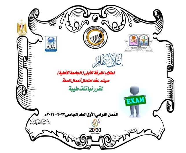 إعلان هام لطلاب الفرقة الأولى (الجامعة الأهلية) سيتم عقد امتحان أعمال السنة لمقرر نباتات طيبة 13 نوفمبر 2023