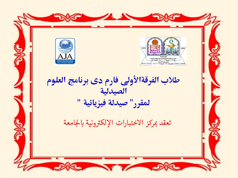 اعلان هام لطلاب الفرقة الأولى فارم دى برنامج العلوم الصيدلية يوم الثلاثاء الموافق 19 أبريل 2022م لمقرر صيدلة فيزيائية" 17 أبريل 2022 اضغط قائمة باسماء الطلاب وارقام الجلوس لمقرر" صيدلة فيزيائية"