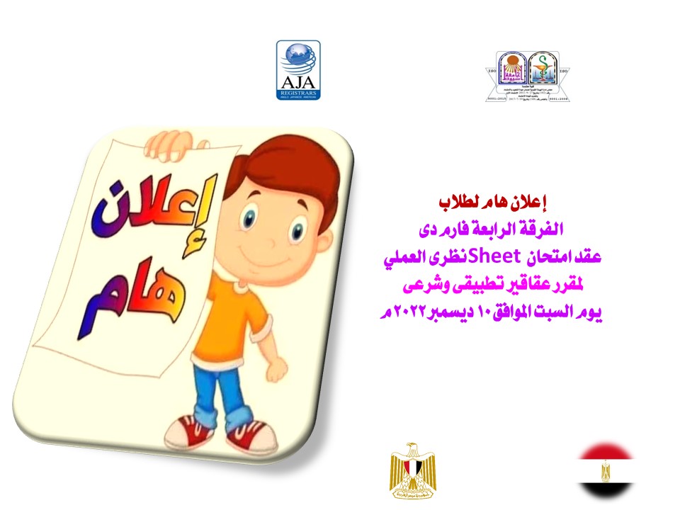 إعلان هام لطلاب الفرقة الرابعة فارم دى عقد امتحان Sheet نظرى العملي لمقرر عقاقير تطبيقى وشرعى يوم السبت الموافق 10 ديسمبر 2022م 7 ديسمبر 2022