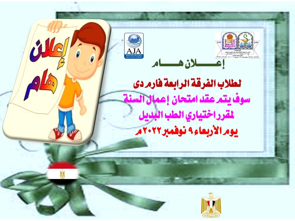 إعلان هام لطلاب الفرقة الرابعة فارم دى سوف يتم عقد امتحان إعمال السنة لمقرر اختياري الطب البديل يوم الأربعاء 9 نوفمبر 2022م 3 نوفمبر 2022