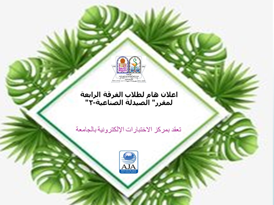 اعلان هام لطلاب الفرقة الرابعة يوم السبت الموافق 9 أبريل 2022 لمقرر" الصيدلة الصناعية-2" 5 أبريل 2022 اضغط قائمة اسماء الفرقة الرابعة فى مقرر" الصيدلة الصناعية-2"