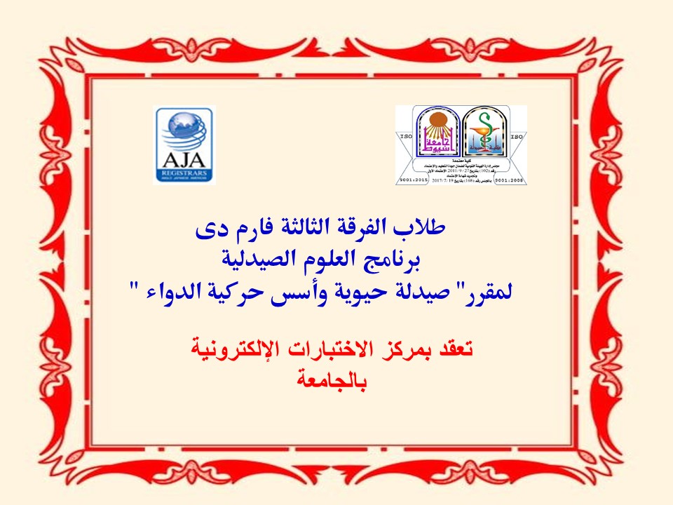 اعلان هام لطلاب الفرقة الثالثة فارم دى برنامج العلوم الصيدلية يوم الخميس الموافق 21 أبريل 2022م لمقرر " صيدلة حيوية وأسس حركية الدواء " 18 أبريل 2022 اضغط قائمة باسماء الطلاب وأرقام الجلوس لمقرر " صيدلة حيوية وأسس حركية الدواء "