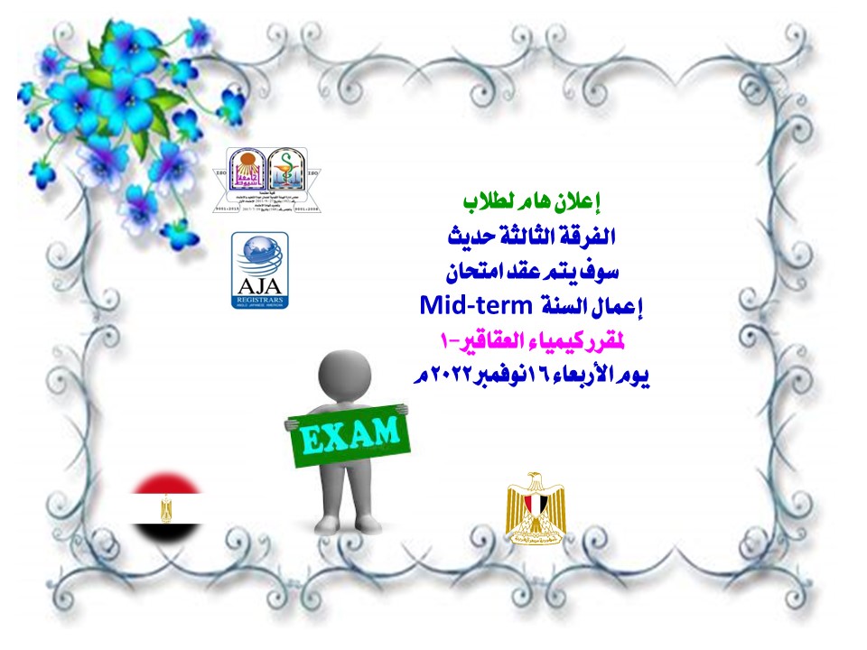 إعلان هام لطلاب الفرقة الثالثة حديث سوف يتم عقد امتحان إعمال السنة Mid-term لمقرر كيمياء العقاقير-1 يوم الأربعاء 16نوفمبر 2022م 6 نوفمبر 2022