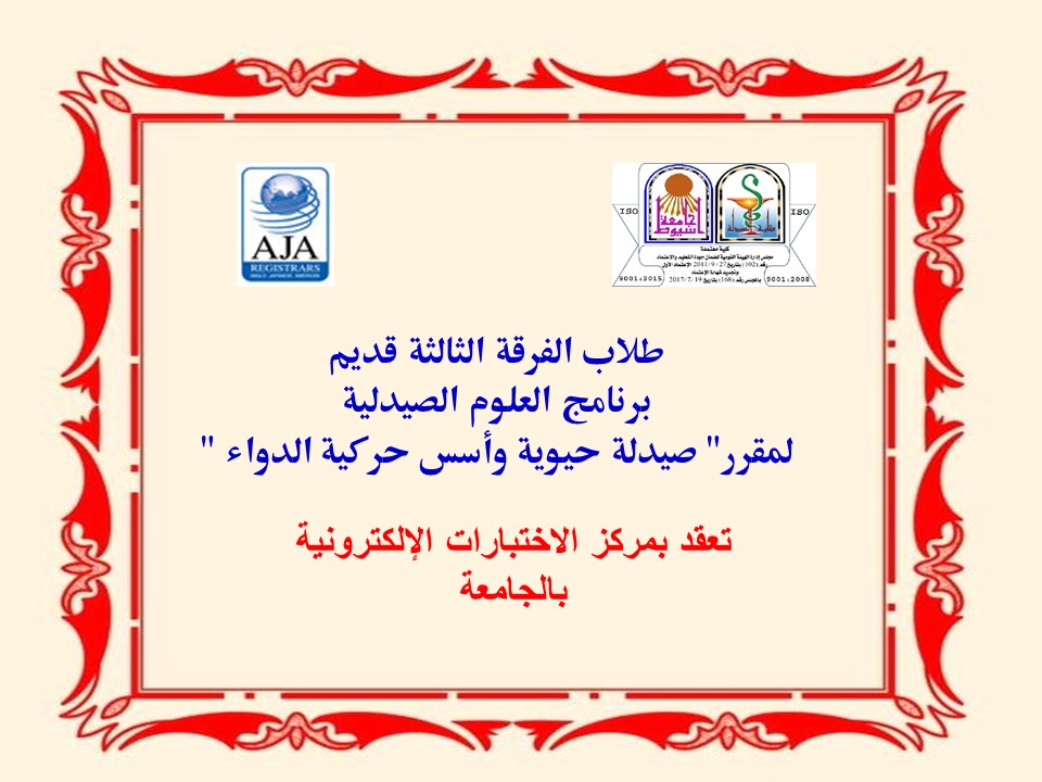 اعلان هام لطلاب الفرقة الثالثة قديم برنامج العلوم الصيدلية يوم الأربعاء الموافق 20 أبريل 2022م لمقرر " صيدلة حيوية وأسس حركية الدواء " 18 أبريل 2022 اضغط قائمة باسماء الطلاب وأرقام الجلوس لمقرر " صيدلة حيوية وأسس حركية الدواء "