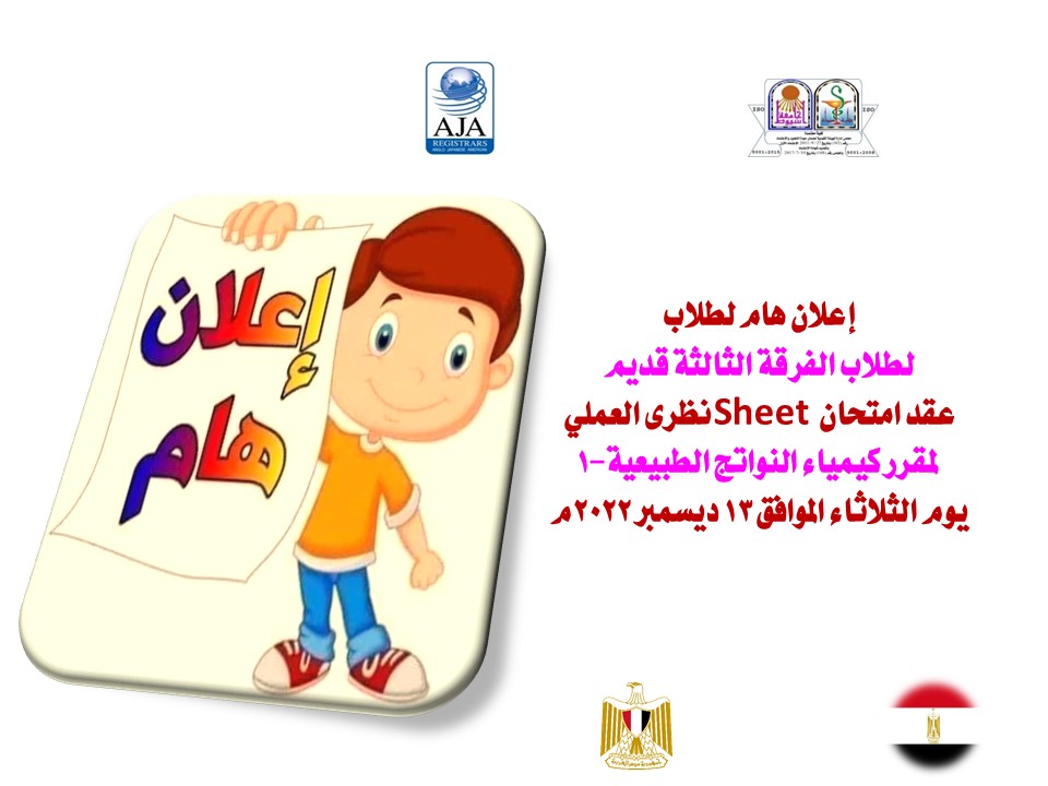 إعلان هام لطلاب الفرقة الثالثة قديم عقد امتحان Sheet نظرى العملي لمقرر كيمياء النواتج الطبيعية-1 يوم الثلاثاء الموافق 13 ديسمبر 2022م 8 ديسمبر 2022