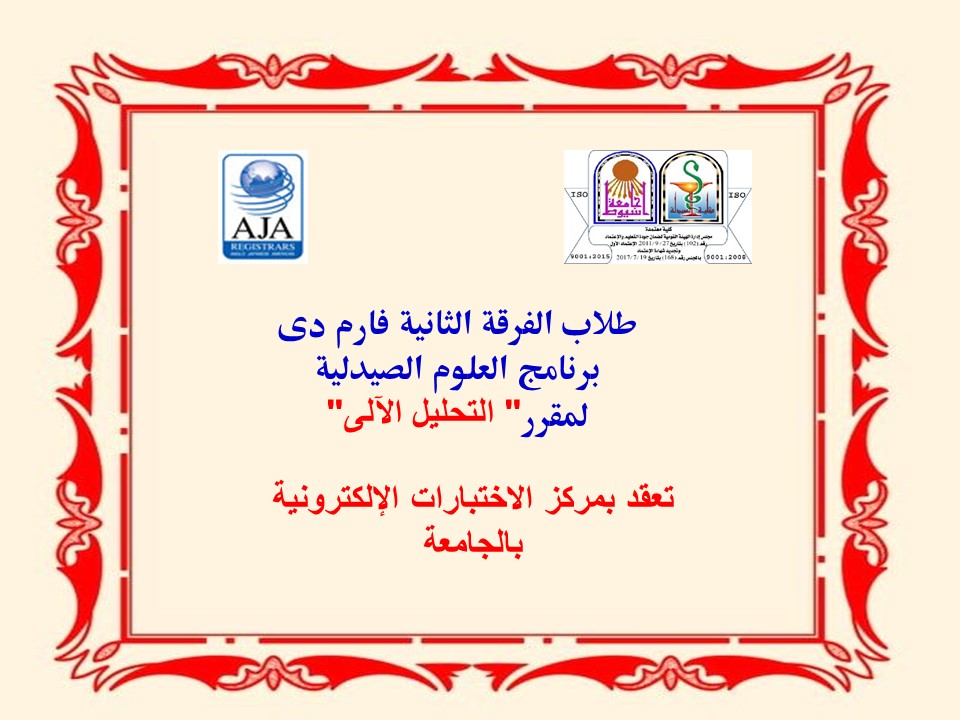 اعلان هام لطلاب الفرقة الثانية فارم دى برنامج العلوم الصيدلية يوم الأربعاء الموافق 20 أبريل 2022م لمقرر "التحليل الآلى" 18 أبريل 2022 اضغط قائمة باسماء الطلاب وأرقام الجلوس لمقرر "التحليل الآلى"