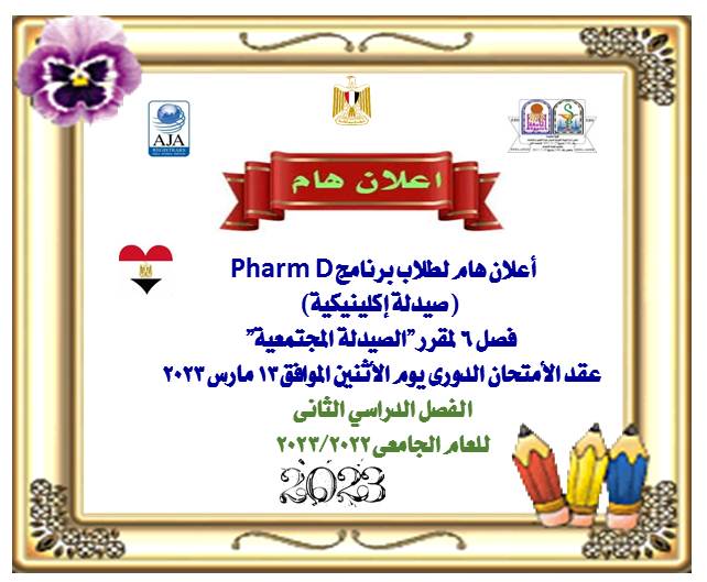 أعلان هام لطلاب برنامج الفارم دى (صيدلة إكلينيكية) فصل 6 لمقرر "الصيدلة المجتمعية" عقد الأمتحان الدورى يوم الأثنين الموافق 13 مارس 20232 11 مارس 2023
