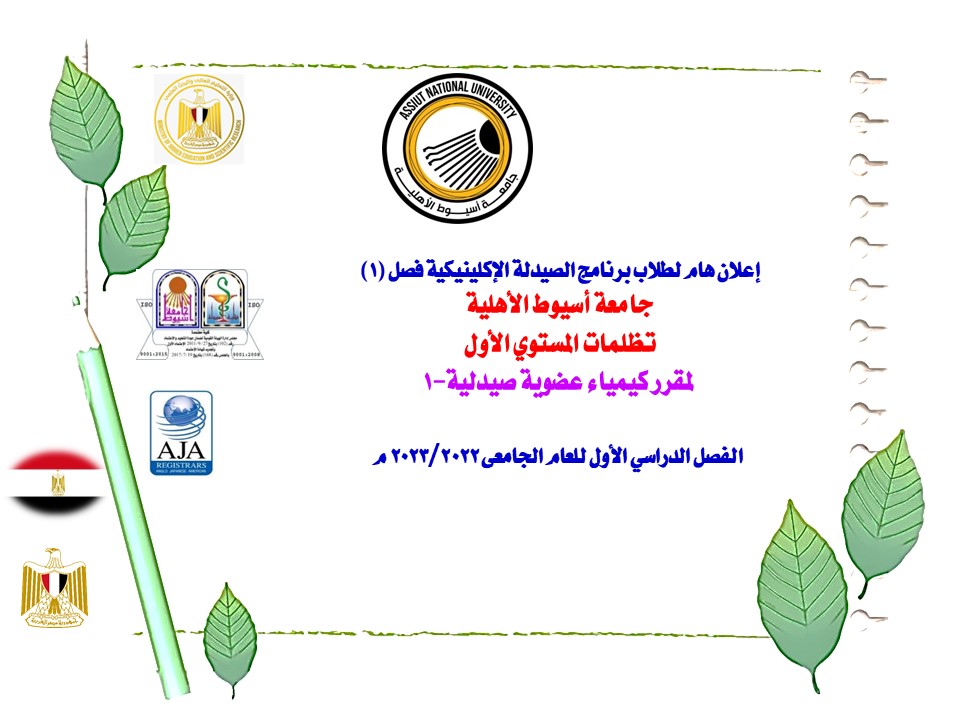 إعلان هام لطلاب برنامج الصيدلة الإكلينيكية فصل (1) جامعة أسيوط الأهلية تظلمات المستوي الأول لمقرر كيمياء عضوية صيدلية-1 24 نوفمبر 2022