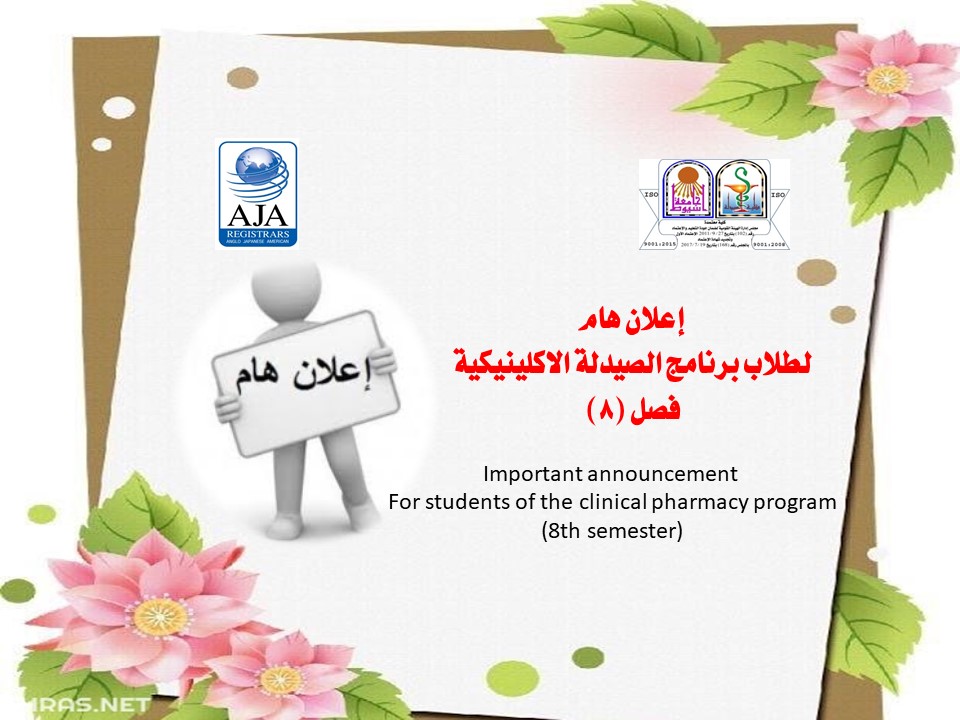 إعلان هام لطلاب برنامج الصيدلة الاكلينيكية فصل (8) لمقرر "علاج الاورام"