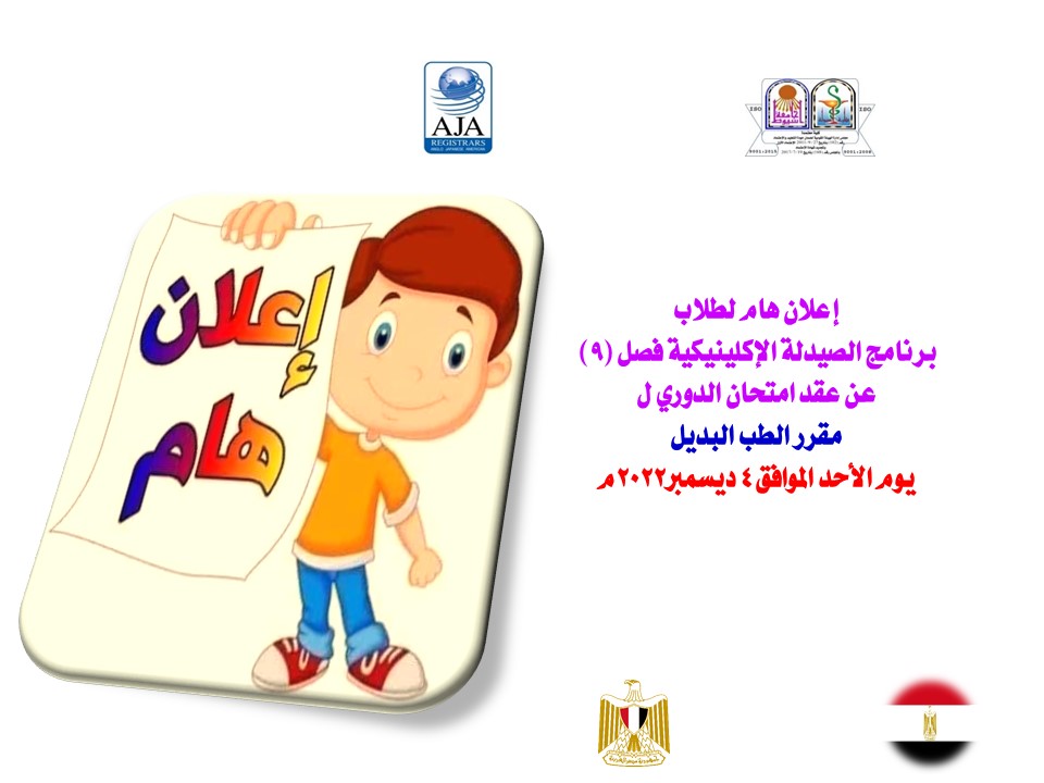 إعلان هام لطلاب برنامج الصيدلة الإكلينيكية فصل (9) عن عقد امتحان الدوري لمقرر الطب البديل يوم الأحد الموافق 4 ديسمبر2022م 1 ديسمبر 2022