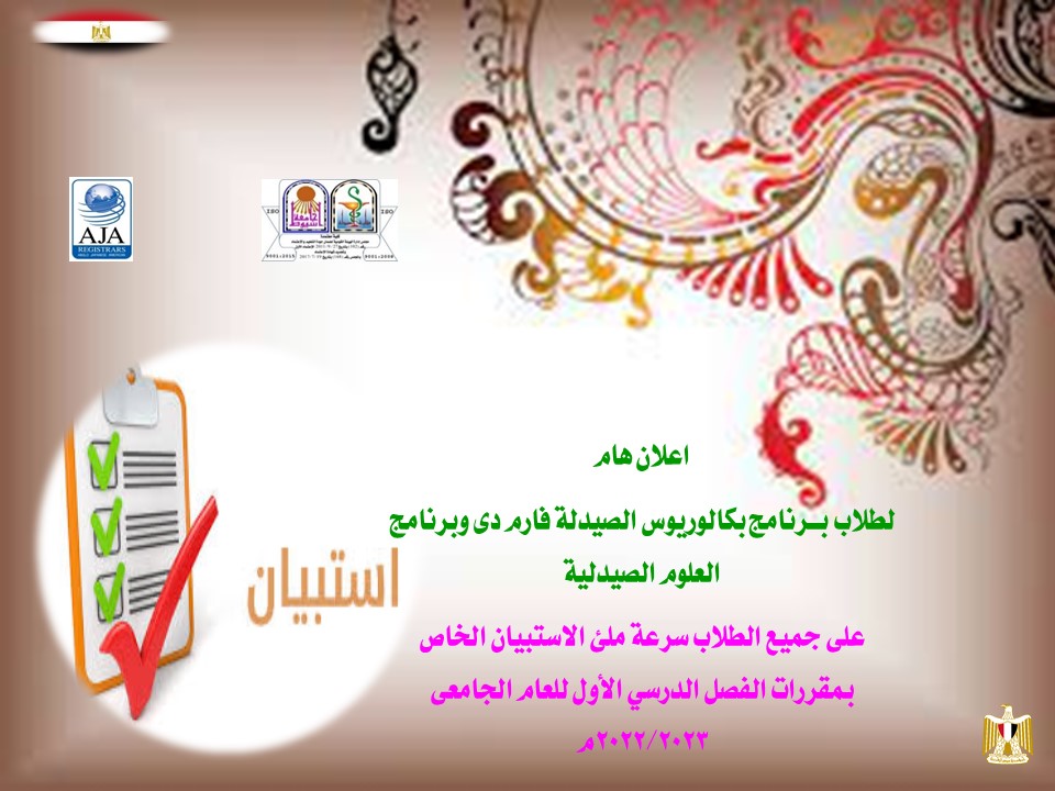 اعلان هام لطلاب بــرنامج بكالوريوس الصيدلة فارم دى وبرنامج العلوم الصيدلية على جميع الطلاب سرعة ملئ الاستبيان الخاص بمقررات الفصل الدرسي الأول للعام الجامعى 2022/2023م