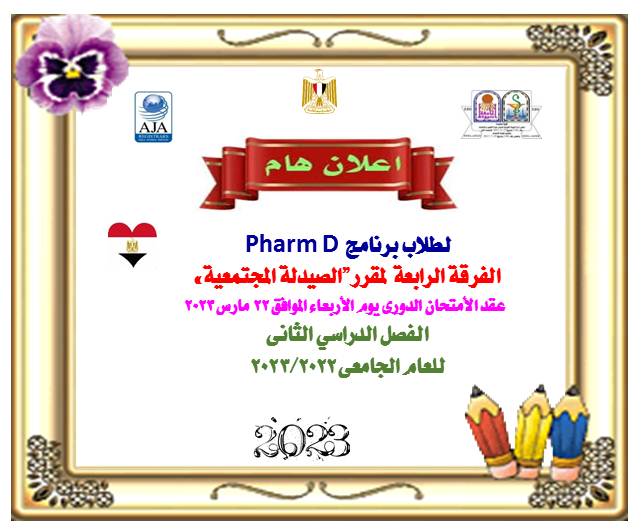 أعلان هام لطلاب برنامج Pharm D الفرقة الرابعة لمقرر "الصيدلة المجتمعية" عقد الأمتحان الدورى يوم الأربعاء الموافق 22 مارس 2023 11 مارس 2023