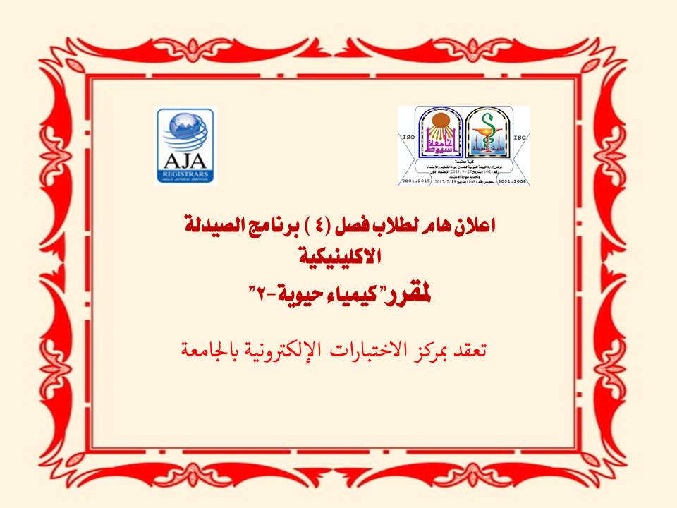 اعلان هام لطلاب فصل (4) برنامج الصيدلة الاكلينيكية يوم الأثنين الموافق 18 أبريل 2022م لمقرر " كيمياء حيوية-2" 17 أبريل 2022 اضغط قائمة باسماء الطلاب وأرقام الجلوس لمقرر " كيمياء حيوية-2"