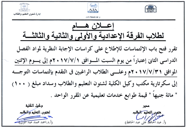 إعلان عن فتح باب الإلتماسات للإطلاع علي كراسات الإجابة النظرية لمواد الفصل الدراسي الثاني لطلاب الفرق الإعدادية والأولي والثانية والثالثة صيدلة. 25 يوليو 2017 إعلان عن فتح باب الإلتماسات للإطلاع علي كراسات الإجابة النظرية لمواد الفصل الدراسي الثاني لطلاب الفرق الإعدادية والأولي والثانية والثالثة صيدلة.
