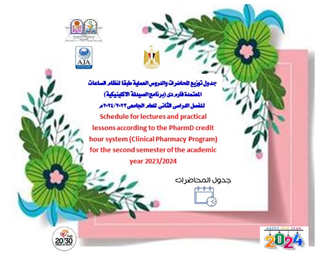 الجداول النهائية للمحاضرات والدروس العملية طبقا لنظام الساعات المعتمدة فارم دى (برنامج الصيدلة الاكلينيكية) للفصل الدراسى الثانى للعام الجامعى 2024/2023م 4 فبراير 2024 اضغط ? اضغط لدخول الى جدول المحاضرات