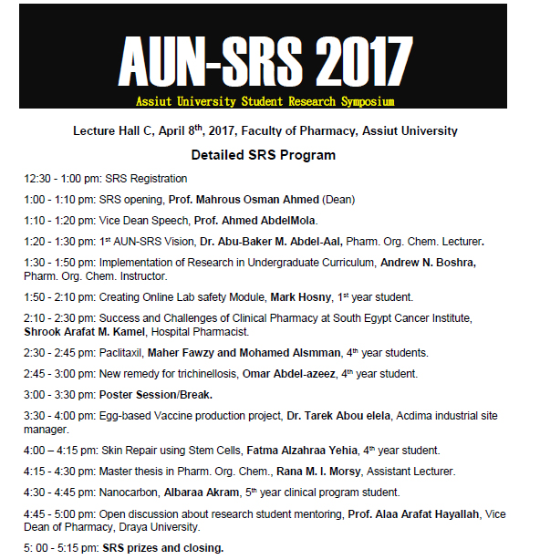 سيعقد بمشيئة الله تعالي المؤتمر البحثي الطلابي الأولي Student Research Symposium بكلية الصيدلة يوم السبت الموافق 8-4-2017م الساعة 1-5 مساءا بمدرج (ج) بالكلية.