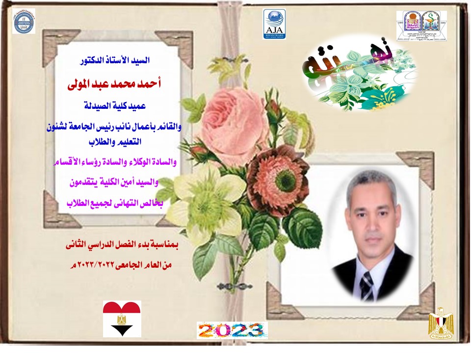 السيد الأستاذ الدكتور/ أحمد محمد عبد المولى - عميد كلية الصيدلة والقائم بأعمال نائب رئيس الجامعة لشئون التعليم والطلاب والسادة الوكلاء والسادة رؤساء الأقسام والسيد أمين الكلية يتقدمون بخالص التهانى لجميع الطلاب بمناسبة بدء الفصل الدراسي الثانى 2023/2022