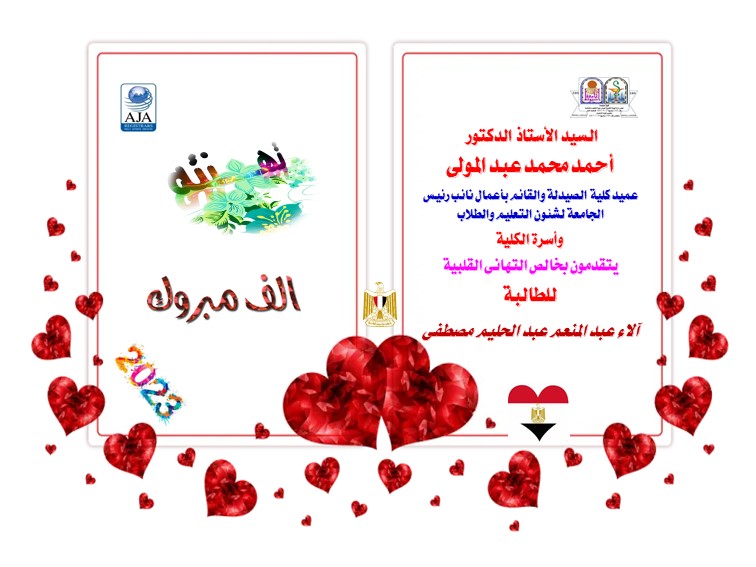 السيد الأستاذ الدكتور/ أحمد محمد عبد المولى عميد كلية الصيدلة والقائم بأعمال نائب رئيس الجامعة لشئون التعليم والطلاب وأسرة الكلية يتقدمون بخالص التهانى القلبية للطالبة/ آلاء عبد المنعم عبد الحليم مصطفى