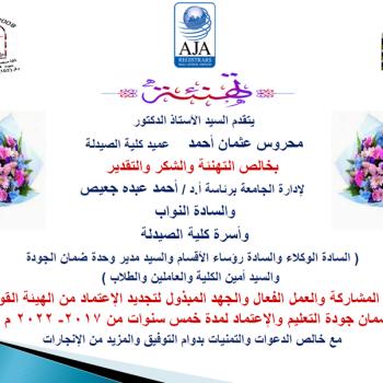 عميد كلية الصيدلة يهنئ إدارة جامعة أسيوط وأسرة كلية الصيدلة بمناسبة حصول كلية الصيدلة علي تجديد الاعتماد من الهيئة القومية لضمان جودة التعليم والاعتماد.