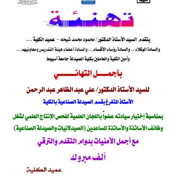 عميد كلية الصيدلة وأسرة الكلية يقدمون خالص التهنئة للسيد الأستاذ الدكتور: أحمد محمد أحمد عبد المولي بمناسبة إختيار سيادته عضواً باللجان العلمية لفحص الإنتاج العلمي لشغل وظائف الأساتذة والأساتذة…