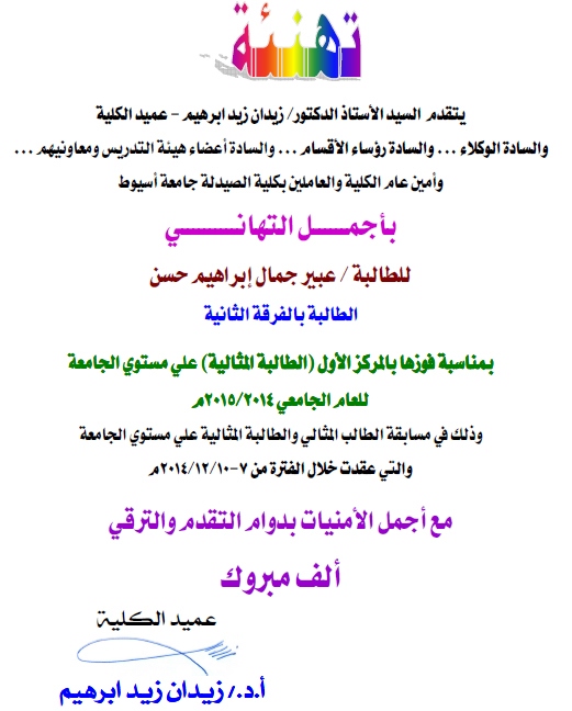 أسرة كلية الصيدلة تهنئ الطالبة/ عبير جمال ابراهيم لفوزها بلقب الطالبة المثالية علي مستوي الجامعة للعام الجامعي 2014/2015م. 12 يناير 2015 أسرة كلية الصيدلة تهنئ الطالبة/ عبير جمال ابراهيم لفوزها بلقب الطالبة المثالية علي مستوي الجامعة للعام الجامعي 2014/2015م.