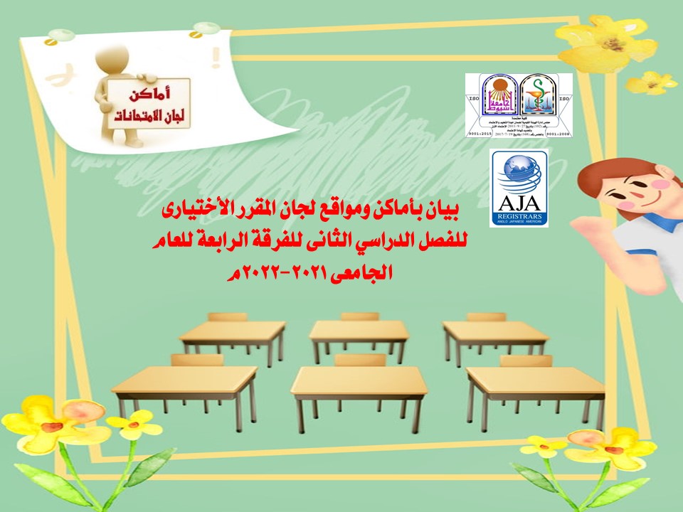 بيان بأماكن ومواقع لجان المقرر الأختيارى للفصل الدراسي الثانى للفرقة الرابعة للعام الجامعى 2021-2022م 17 مايو 2022
