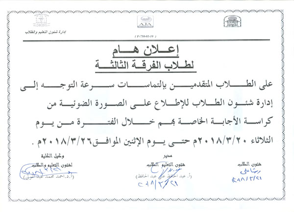 هام لطلاب الفرقة الثالثة المتقدمين بإلتماسات للإطلاع علي الصورة الضوئية من كراسة الإجابة الخاصة بهم. 22 مارس 2018 هام لطلاب الفرقة الثالثة المتقدمين بإلتماسات للإطلاع علي الصورة الضوئية من كراسة الإجابة الخاصة بهم.