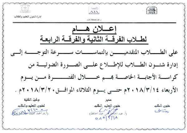 هام لطلاب الفرقة الثانية والرابعة المتقدمين بإلتماسات للإطلاع علي الصورة الضوئية من كراسة الإجابة الخاصة بهم. 18 مارس 2018 هام لطلاب الفرقة الثانية والرابعة المتقدمين بإلتماسات للإطلاع علي الصورة الضوئية من كراسة الإجابة الخاصة بهم.