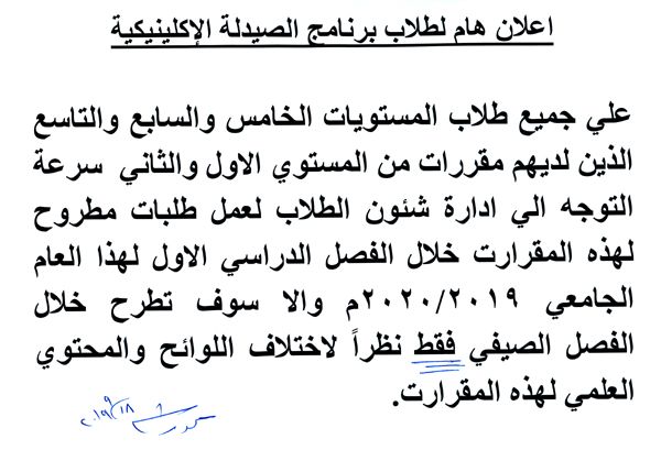 هام لطلاب الصيدلة الإكلينيكية المستويات الخامس والسابع والتاسع الذين لديهم مقررات من المستوي الأول والثاني. 18 سبتمبر 2019 هام لطلاب الصيدلة الإكلينيكية المستويات الخامس والسابع والتاسع الذين لديهم مقررات من المستوي الأول والثاني.