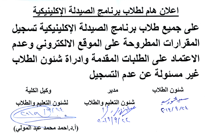 هام لطلاب الصيدلة الإكلينيكية بشأن تسجيل المقررات المطروحة. 24 سبتمبر 2019 هام لطلاب الصيدلة الإكلينيكية بشأن تسجيل المقررات المطروحة.
