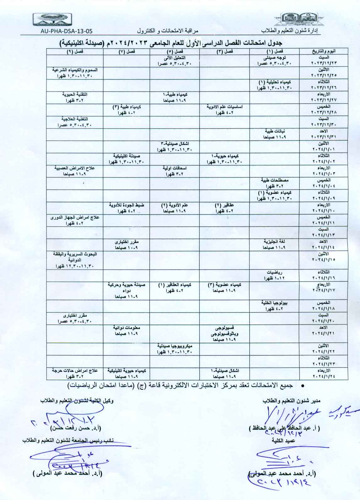 جدول امتحانات الفصل الدراسي الأول للعام الجامعى ٢٠٢٣-٢٠٢٤ برنامج الصيدلة الاكلينيكية