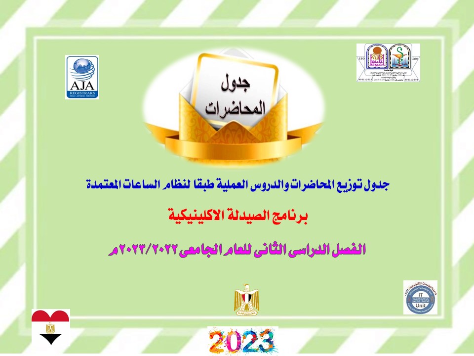 جدول توزيع المحاضرات والدروس العملية طبقا لنظام الساعات المعتمدة برنامج الصيدلة الاكلينيكية الفصل الدراسى الثانى للعام الجامعى 2023/2022م 26 فبراير 2023