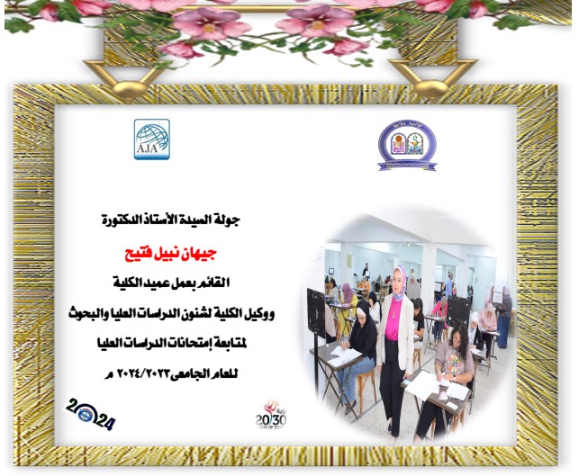 قامت السيدة الأستاذ الدكتور / جيهان نبيل فتيح - القائم بعمل عميد الكلية ووكيل الكلية لشئون الدراسات العليا والبحوث ، بعمل جولة تفقدية لمتابعة إمتحانات الدراسات العليا للعام الجامعى 2023/2024م
