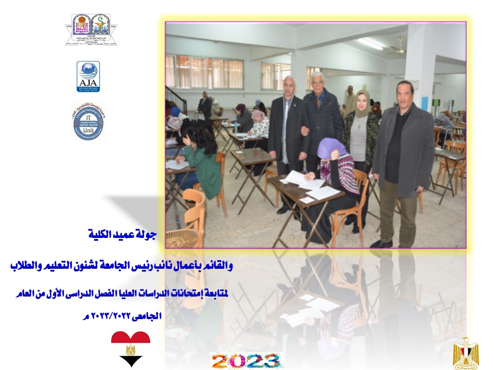 قام السيد الأستاذ الدكتور / أحمد محمد عبدالمولى – عميد الكلية والقائم بأعمال نائب رئيس الجامعة لشئون التعليم والطلاب ترافقه السيدة الأستاذ الدكتورة / جيهان نبيل حسن – وكيل الكلية لشئون الدراسات العليا والبحوث و السيد الأستاذ الدكتور / حسن رفعت حسن – وكيل الكلية لشئون التعليم والطلاب بعمل جولة تفقدية لمتابعة إمتحانات الدراسات العليا الفصل الدراسى الأول للعام الجامعى 2022/2023م و ذلك للإطمئنان على الإلتزام بكافة التعليمات المنظمة لعملية الإمتحانات