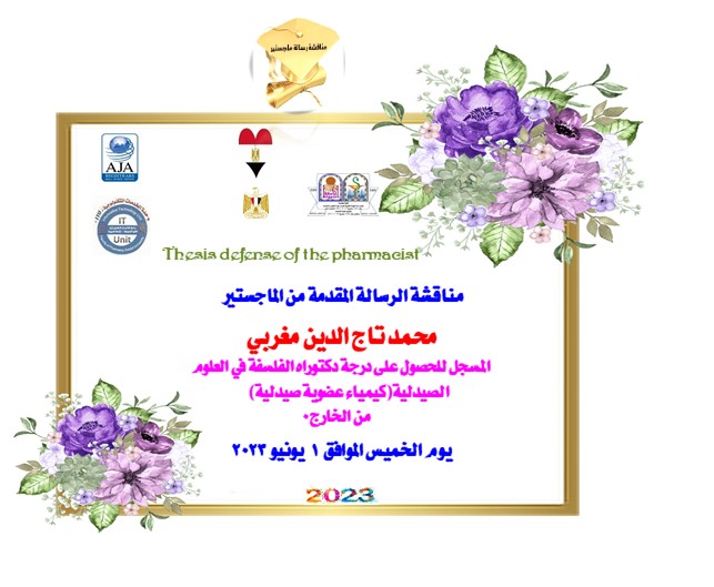 مناقشة الرسالة المقدمة من الماجستير / محمد تاج الدين مغربي - المسجل من الخارج للحصول على درجة دكتوراه الفلسفة في العلوم الصيدلية(كيمياء عضوية صيدلية) يوم الخميس الموافق 1 يونيو 2023